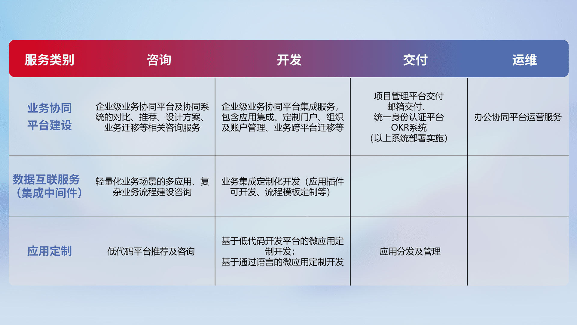 针对钉钉、、企微、、IDaas等平台级产品提供产品的规划、、、方案、、、、交付、、、、定制化开发等服务,,实现如统一协同办公、、、、智能客户服务、、、、混合会议管理、、、、智能数据查询、、、等业务场景,,,实现数字化转型。。。。